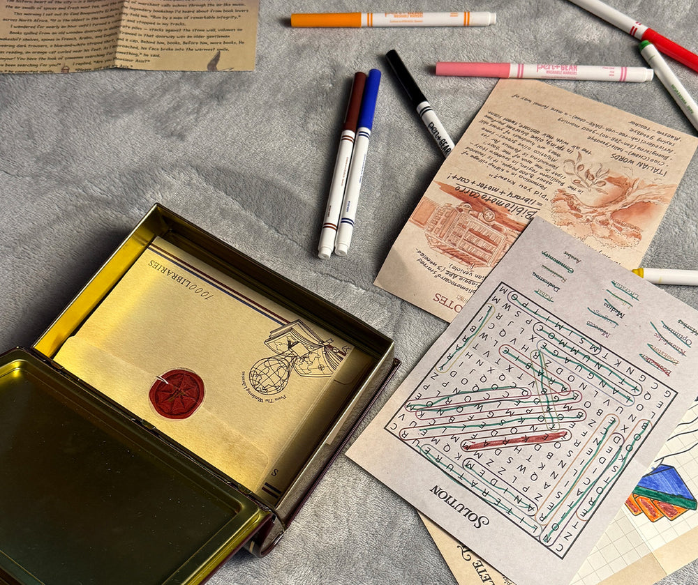 Each month, a new envelope arrives filled with illustrated letters and travel documents. Share it with your kids, store them in a tinbox on your bookshelf, or simply enjoy a few minutes away from the screen.